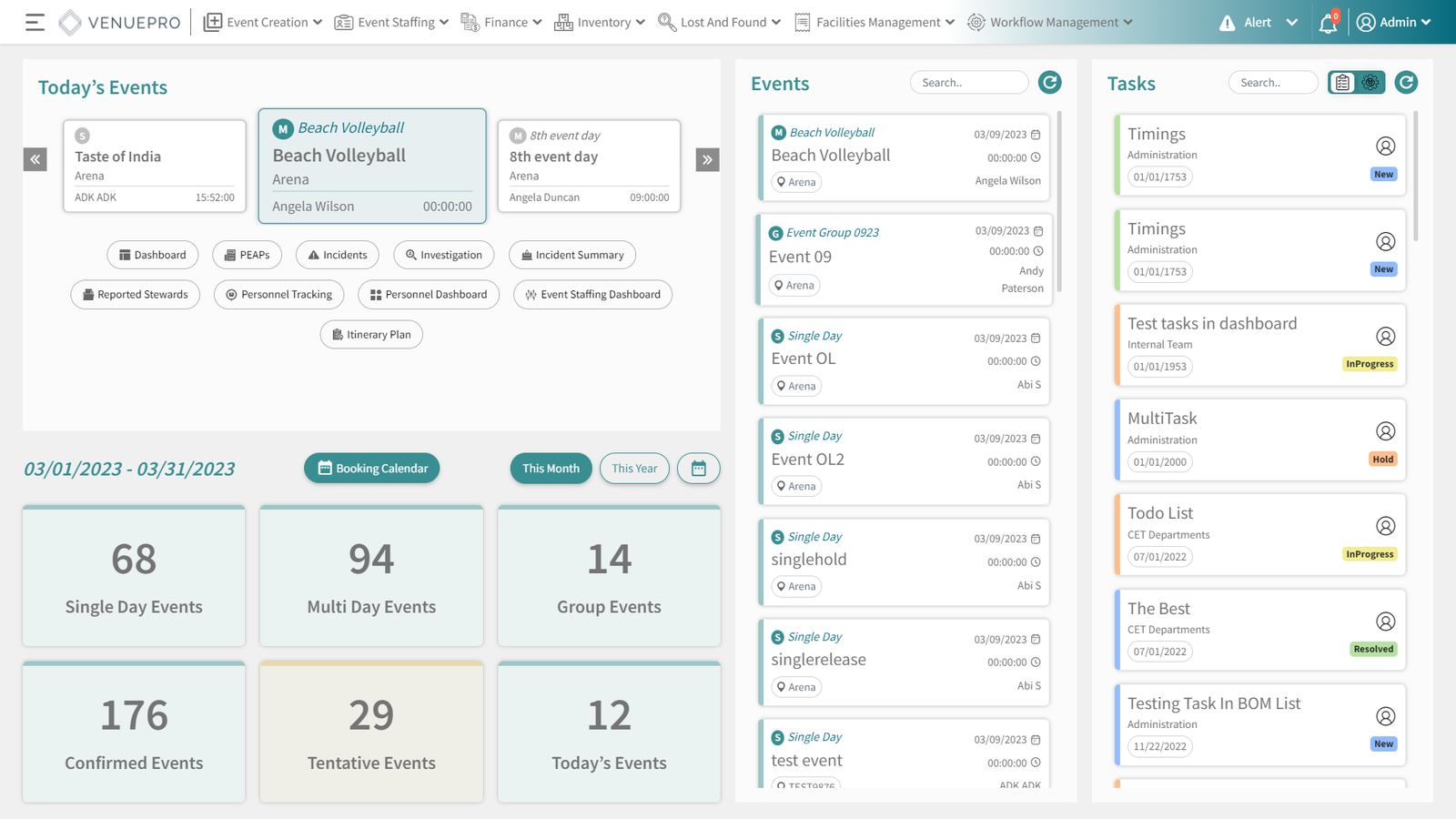 Three sub modules shown for staffing, incidents and crowd control, alerts are clearly visible on the dashboard for ease with permissions and access rights which can be assigned by user.