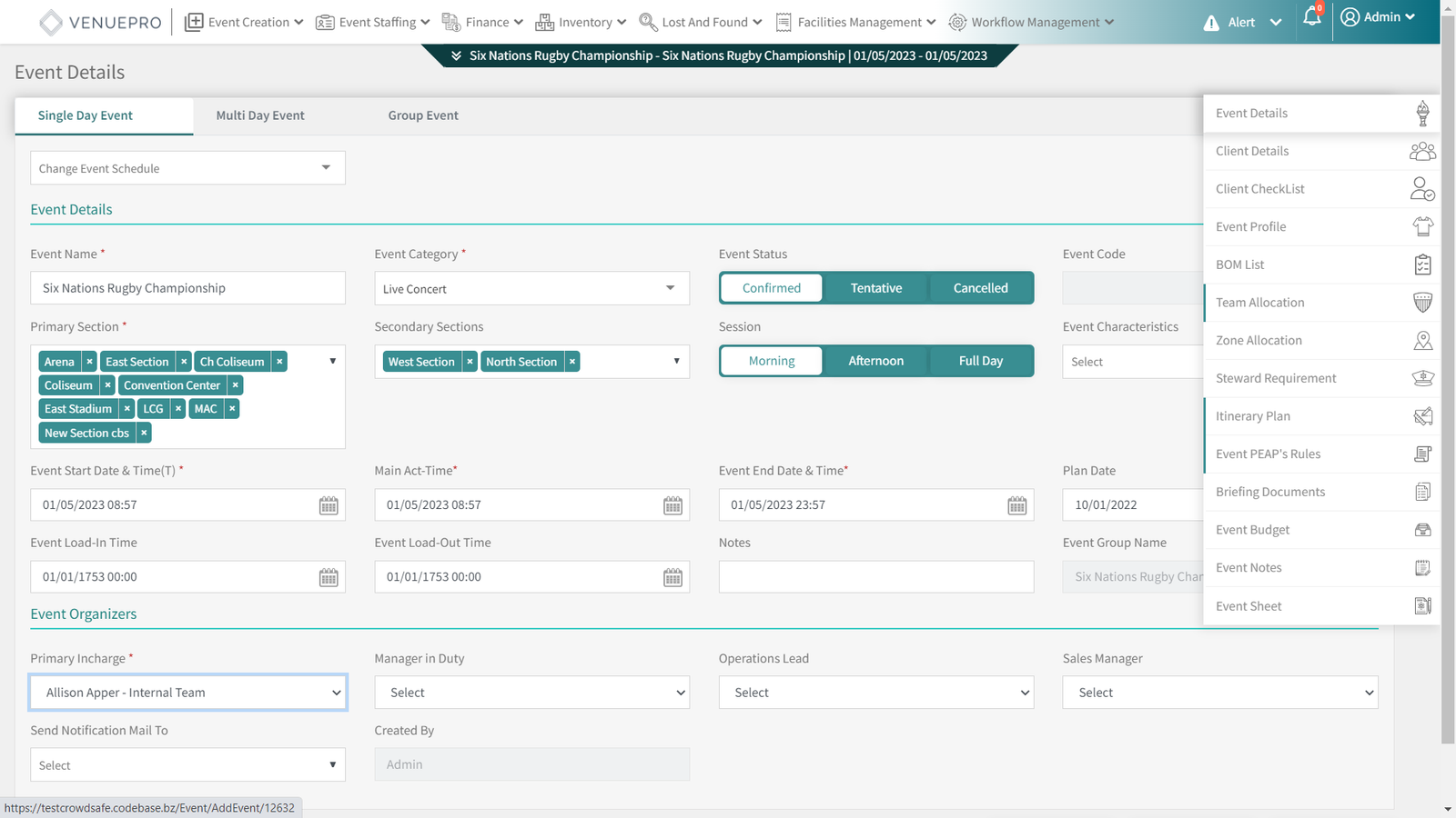 Assign event organizers and set up all event day information so that full details can be easily accessed by all stakeholders.