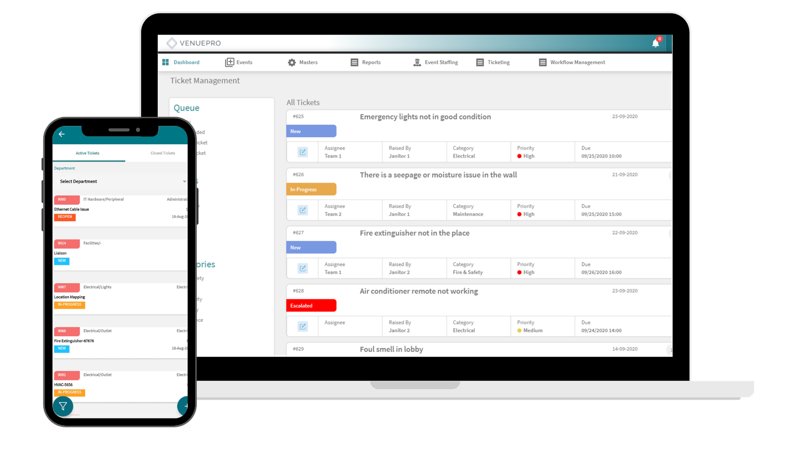 VenuePro helps all of those involved in the facilities management of your venue by providing a complete management solution which allows all stakeholders to be able to raise, assign and track maintenance tickets in real time, manage assets and facilities issues, plan scheduled maintenance and manage finance and accounting.