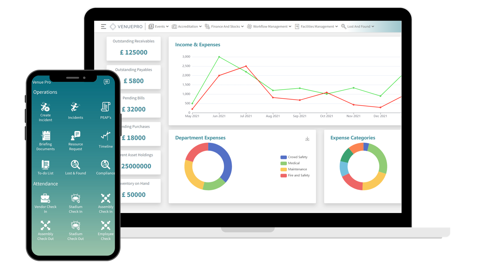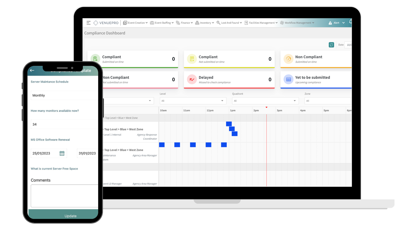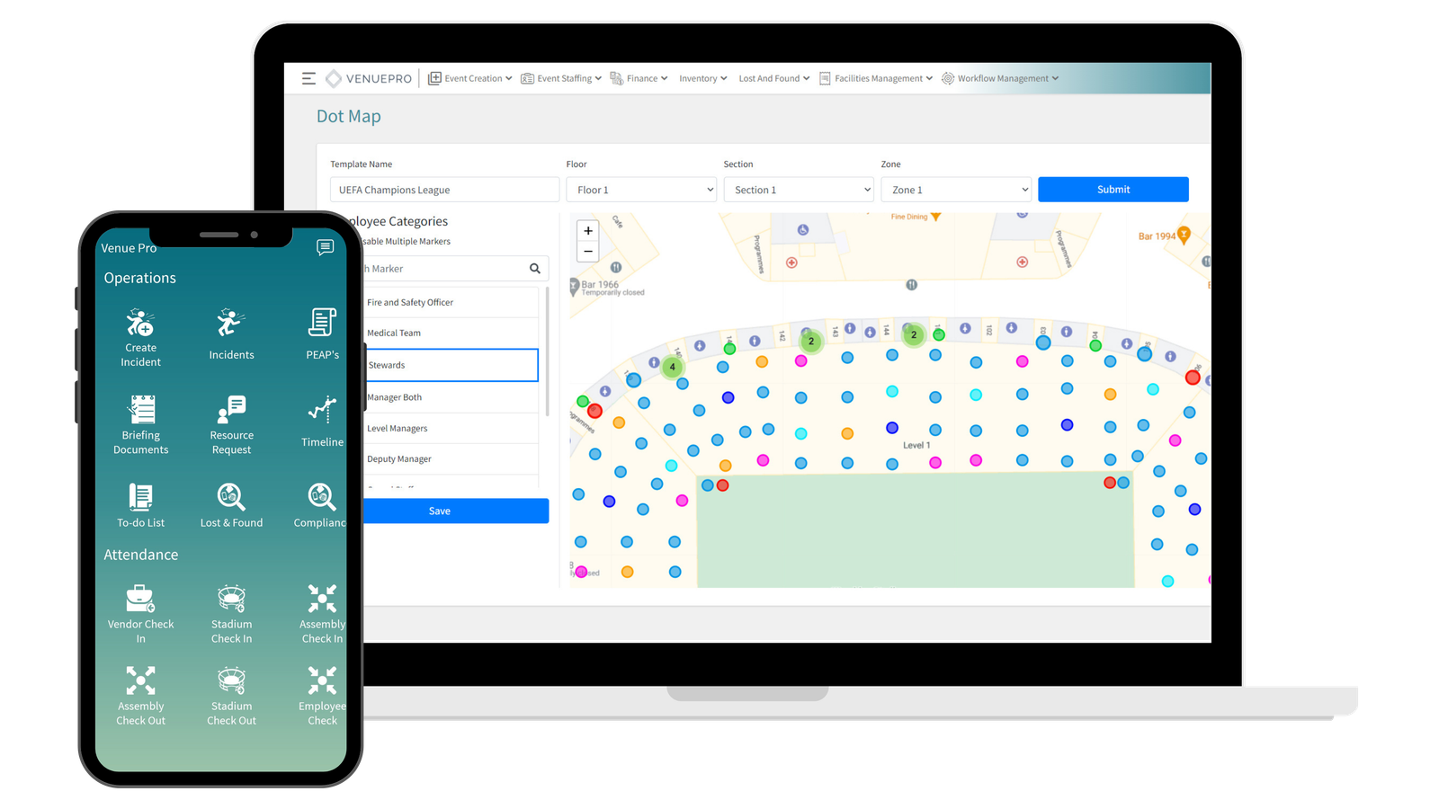 VenuePro helps all of those involved in the Operation of a venue through ensuring easy event management and scheduling, full compliance with regards to pre and post event checks, improving communication between all team members, incident management and effortlessly managing all staffing requirements.
