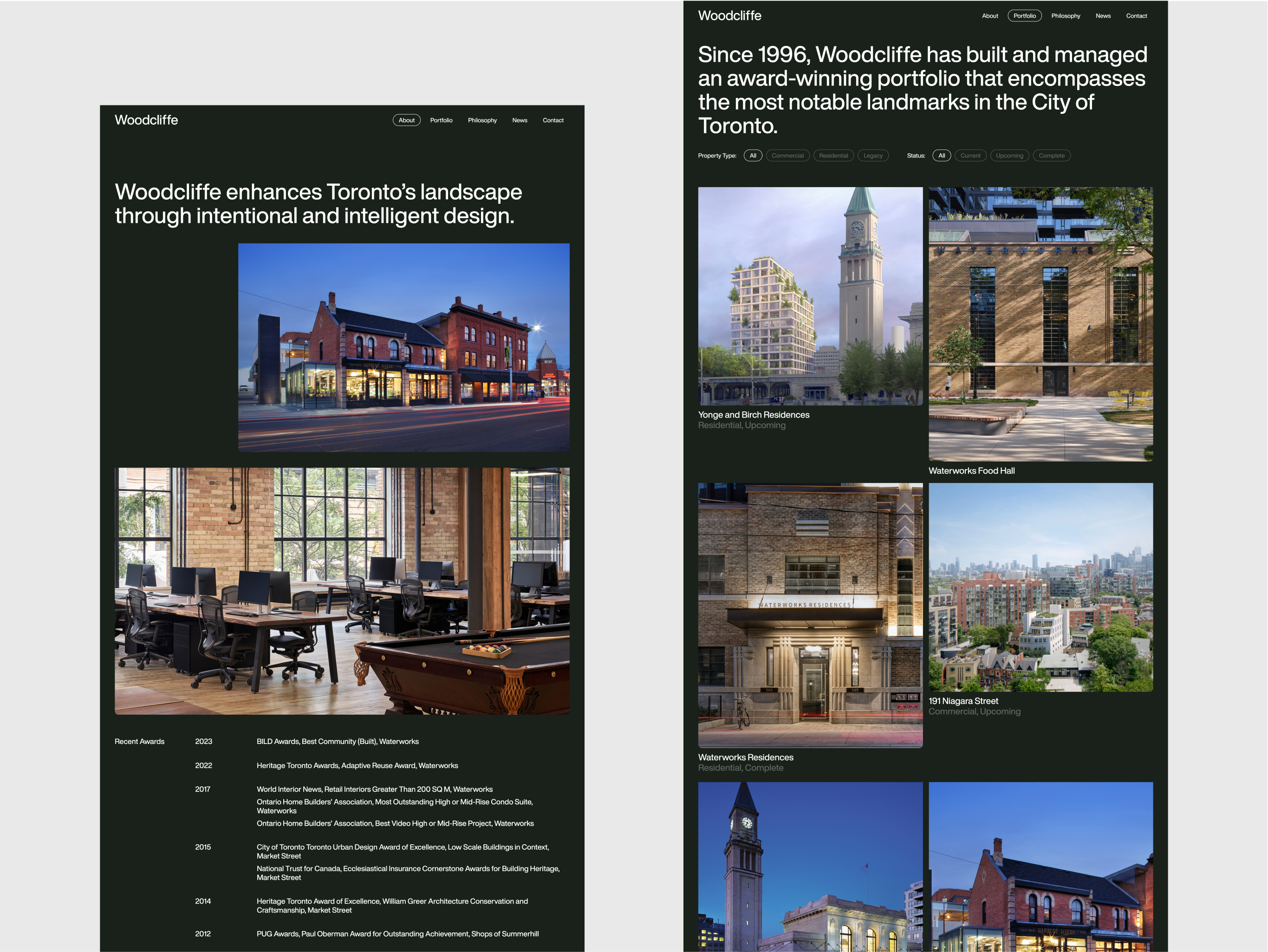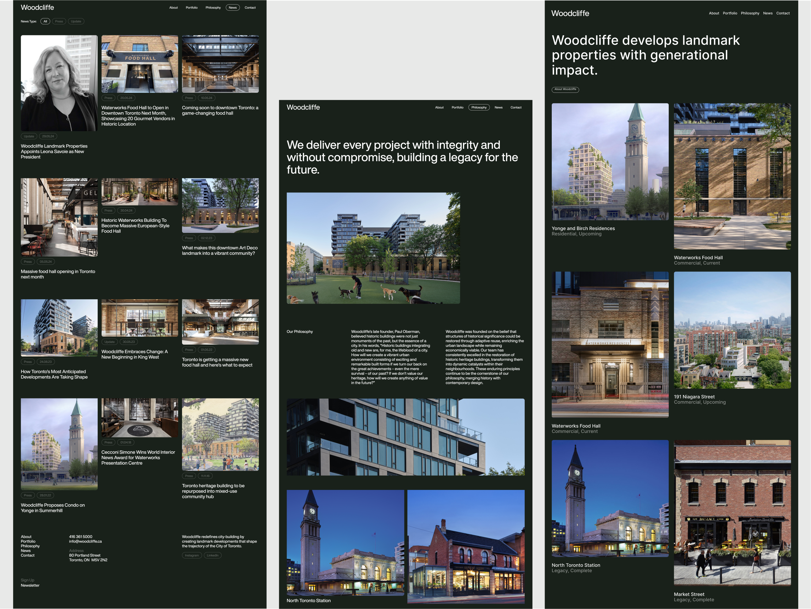 The site opens with story and substance. From roots in historic restoration to an evolution into modern, mixed-use development, every page reinforces Woodcliffe’s commitment to design excellence and city-building.